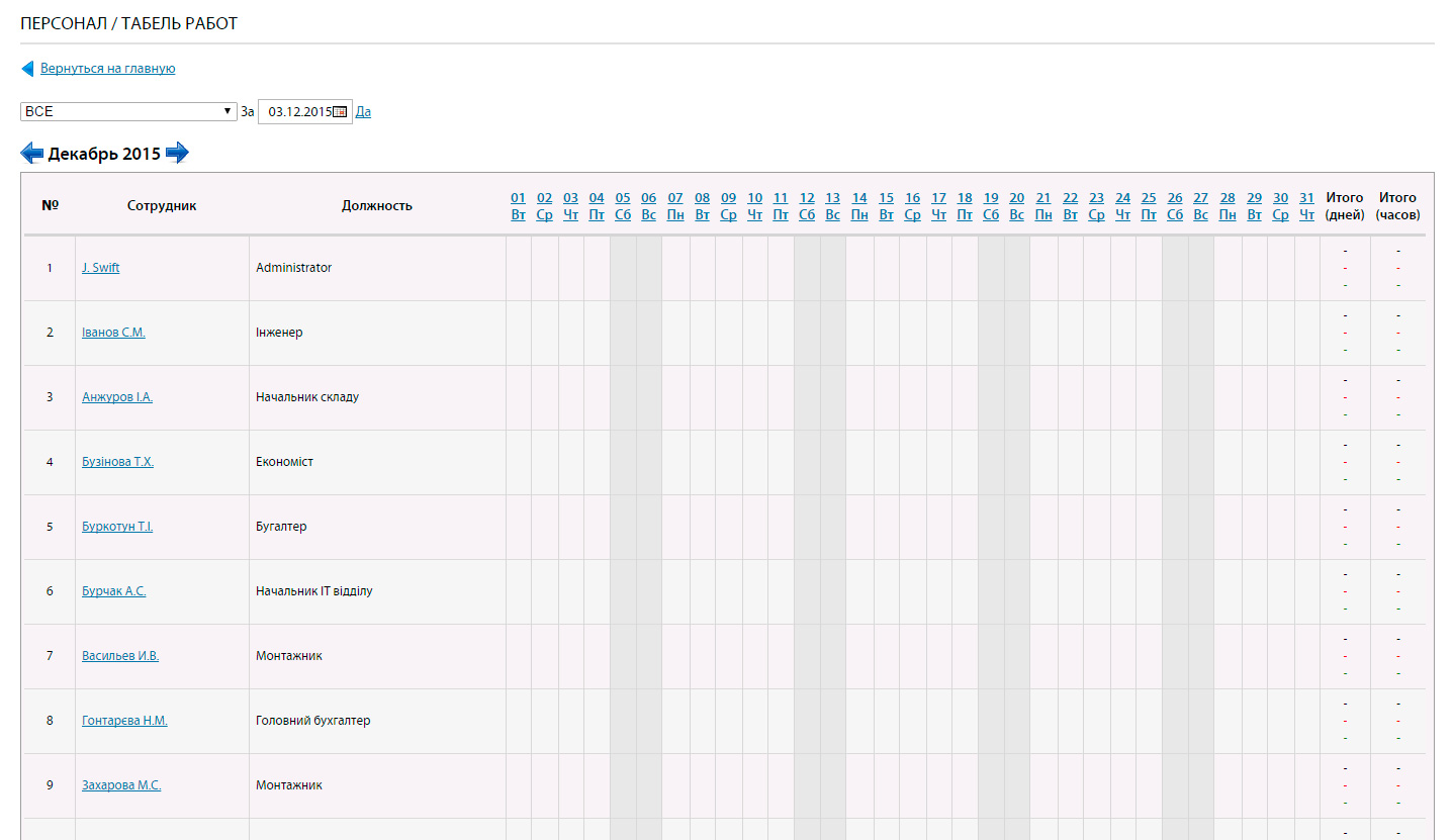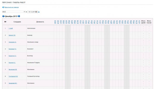 Персонал: учет подразделений различной вложенности, подробные карточки сотрудников, возможность назначения сотрудника в несколько подразделений с различными ролями, табель работ, ведомости, штрафы и премии, учет автотранспорта.
