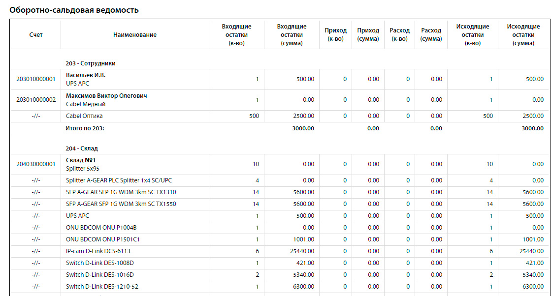 Склад: каталог товаров и поставщиков, различные склады, объекты и типы, серийные и инвентарные нгомера, ведомости и отчеты, накладные, предустановленная база оборузования, интеграция ТМЦ друг в друга, резервы на складах, энергопотребление и отчеты, система разделения доступа.