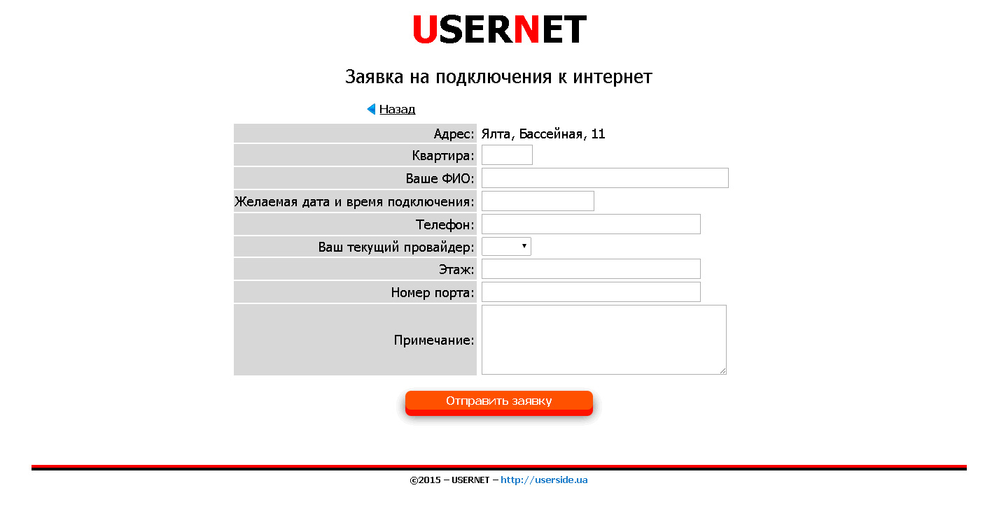 Заявки на подключение новых абонентов: могу быть отдельной страницей или встраиваются в корпоративный сайт. Настраиваемый внешний вид, вывод возможных адресов, настраиваемый тип работ.