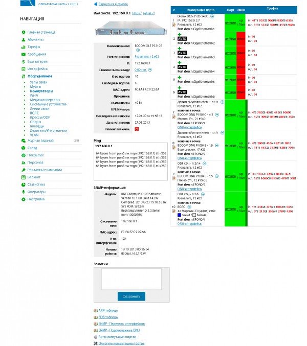 Ну и многое другое: возможность изменения внешнего вида заглавной страницы, взаимодействие с различными SMS-сервисами, произвольные ссылки в меню и настраиваемые страницы, блокнот с различными разделами и ограничением доступа, учёт VLAN и автоматический сбор их использования на коммутаторах, контроль версий прошивок коммутаторов и формирование отчётов, автоматическая привязка абонентов к портам оборудования (логическая) на основании MAC-адресов, ведение истории по действиям операторов, учет собственников объектов, учёт ключей по домам, возможность импорта данных из сторонних/собственных биллинговых систем, язык интерфейса системы может меняться для каждого оператора индивидуально, функционал планирования построения объектов, импорт существующих справочников узлов связи, муфт, оборудования.
