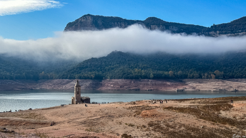 В 2022 году в Каталонии была сильная засуха, и на водохранилище Сау осталось всего 18% от обычного объема воды, в результате чего затопленная церковь Sant Roma de Sau оказалась полностью на суше, а раньше от нее только маковка из воды торчала. Я тогда туда съездил ее сфотографировать, она выглядела вот так.
