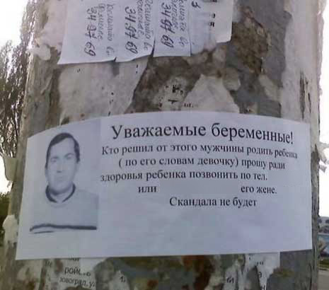 Неужели кто-то верит в реальность намерений оградить женщину/ребенка от болезни, а также в то, что автор объявления реально рассчитывает на звонок? Отнюдь. По моему глубокому убеждению цель объявления одна - испугать. Понятно, что звонить никто не будет, а вот прочитав, накрутить себя (у беременных это запросто) и спровоцировать тем самым выкидыш (чего скорее всего и добивается жена) - запросто. Все болезни выявляются в женской консультации, так что "рекомендации" умирающей от ревности жены оградить от чего-то там ребенка просто смешны.