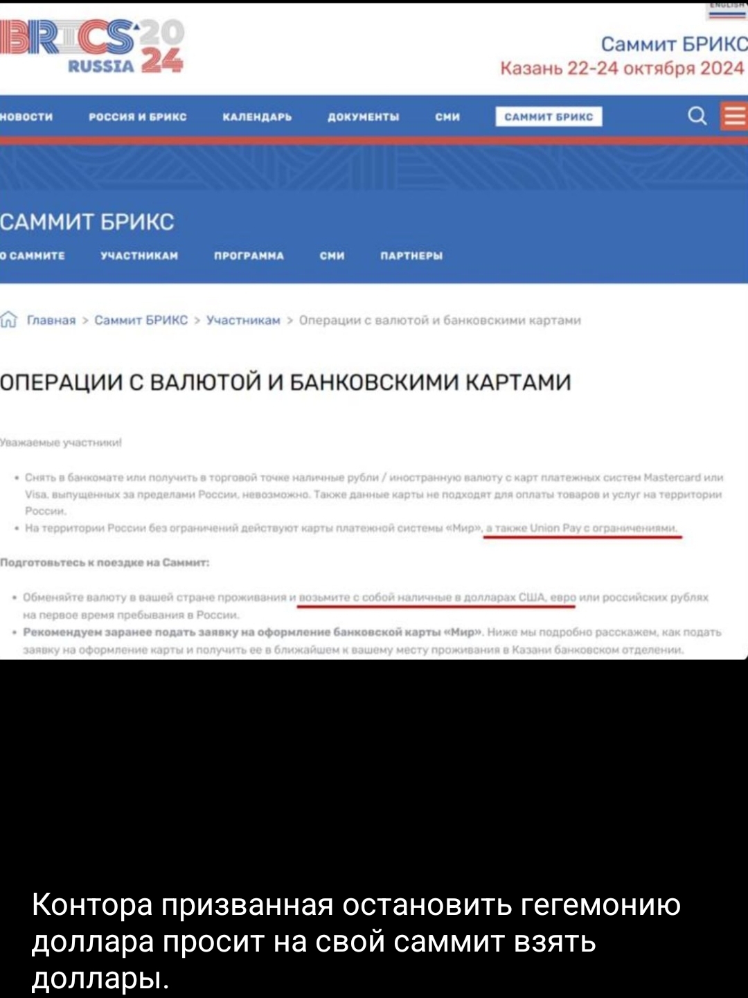 Вместо этого Россия советует участникам саммита брать с собой доллары или евро, добавляя, что это единственные валюты, которые можно «свободно обменять на наличные рубли в большинстве банков России». Также предлагается использовать российскую карту «Мир» и дается инструкции по ее получению, в том числе в аэропорту Казани.