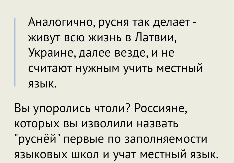 Аналогично, русня так делает - живут всю жизнь в Латвии, Украине, далее везде, и не считают нужным учить местный язык.