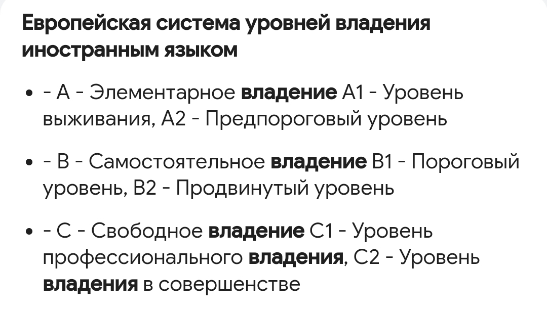 Ну и деление на уровни ниже ничего общего с деление испанского языка не имеет. А2 - уже свободное общение на бытовые темы, грамматика с 9 временами и 6 спряжений глаголов и многое другое. С1 - это да, уровень на котором разрешается работать переводчиком, его и местные то далеко не все знают.