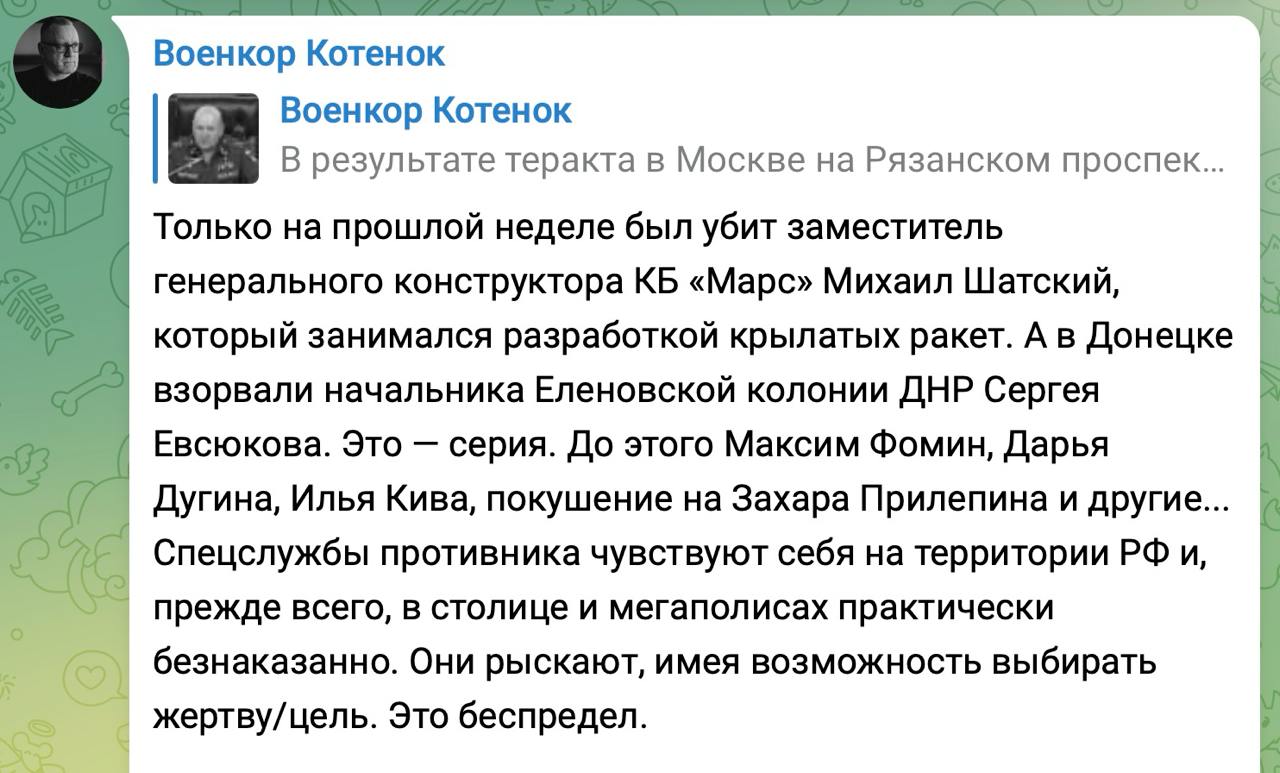 На прошлой неделе подорвали директора колонии в Оленовке (где погибли пленные бойцы Азова), потом прибили заместителя главного конструктора КБ "Марс. Сейчас вот генерала на самокате покатали. Про Татарского и Киву не будем забывать.