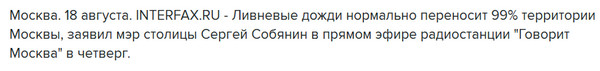 А вы знаете, в чем-то Собянин прав! Вот например я как имеющий московскую недвижимость и прописку в ней отлично переношу ливневые дожди и затопления, находясь на территории королевства Испании. Сводки из Москвы читаю как научную фантастику, например вот вчера ядренный реактор так и не взорвался, а то могло получиться, что и приезжать некуда.. ria.ru/incidents/20160820/1474846422.html