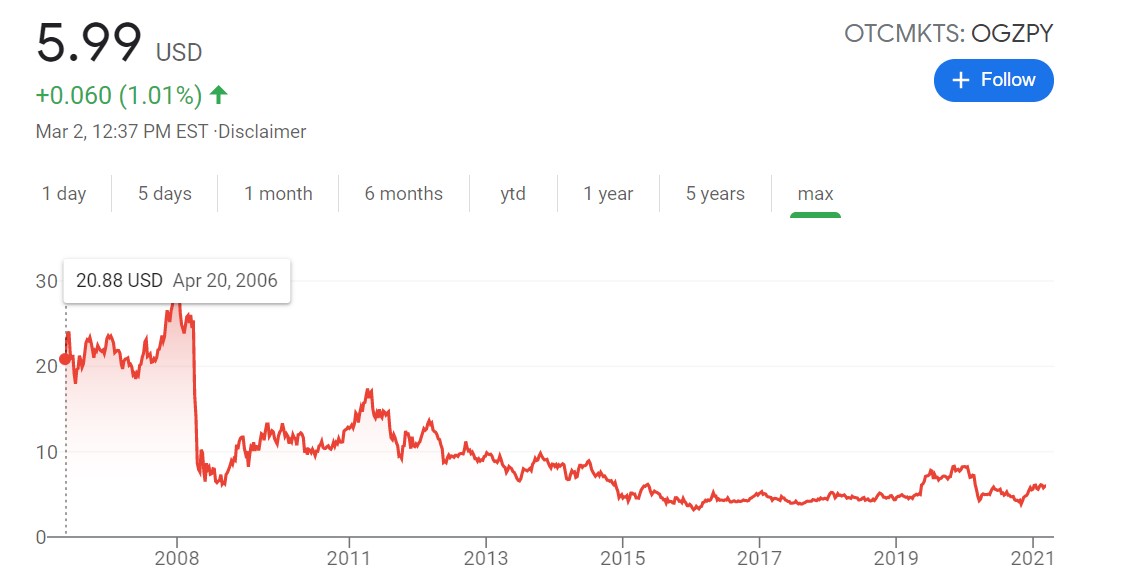 Т.е. еще раз, проблема с Газпромом не том, растет он или не растет, за выбранные вами период в 5 лет (то есть после просадки в результате крымских санкций) в России выросло все, а в том, что при прибыли в 19м в 20 миллиардов в год (Арамко 90) стоит не в 4 раза меньше, а в 28. Газпром, который не управляется жуликами, вполне мог бы стоить минимум в 4-5 раз больше.