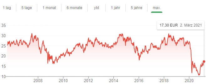 Royal Dutch Shell: 5 лет назад акция стоила больше 20 евро, сегодня - 17 евро.