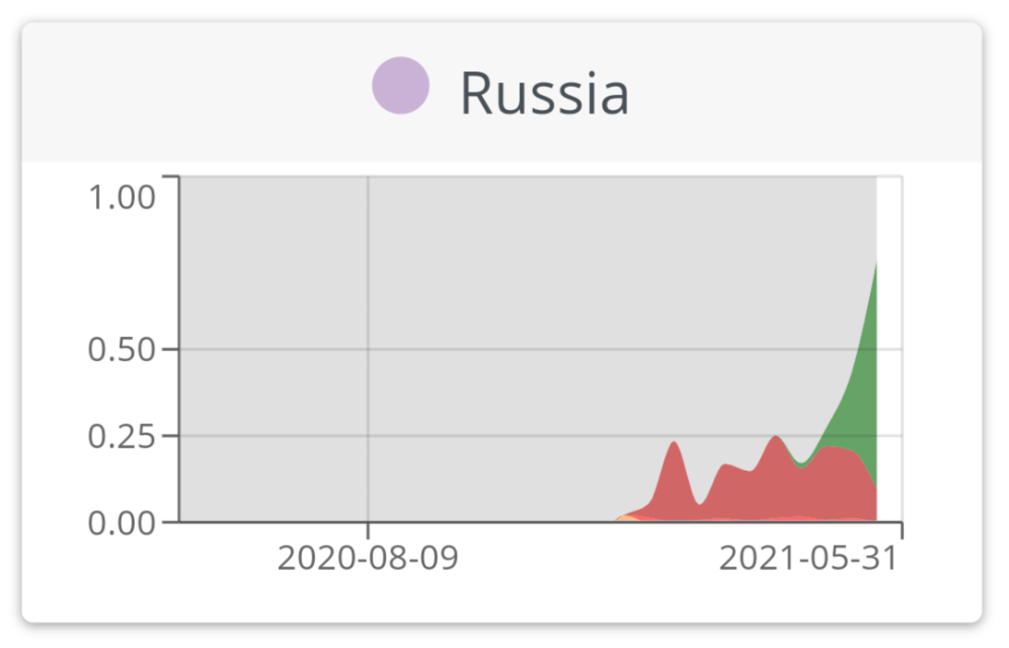 Мы точно знаем, что это справедливо по крайней мере относительно Санкт-Петербурга — единственного региона, где данных секвенирования достаточно для того, чтобы оценить текущую долю всех вариантов и их динамику. Согласно этим данным, новый штамм распространялся в городе в последние два месяца с экспоненциальной скоростью, потеснив даже известный своей заразностью вариант альфа («британский»). По остальным регионам страны, где данных слишком мало, известно, что этот вариант находят в самых разных точках страны, причем даже там, где число прочитанных геномов вируса исчисляется единицами. Это означает, что Санкт-Петербург точно не исключительный случай, а, скорее всего, отражение ситуации в целом по стране».