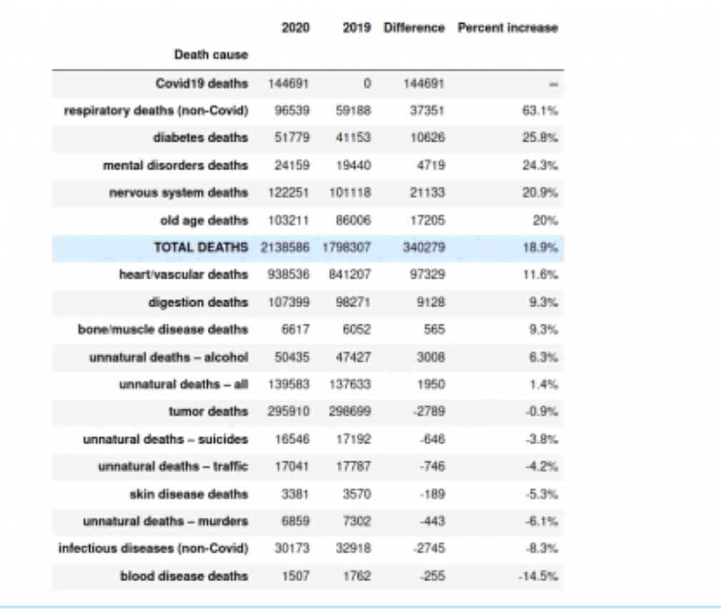 В докладе "Мировая статистика здравоохранения" подчеркивается, что "согласно предварительным оценкам, избыточная смертность в Американском регионе в 2020 году составила 1,34 - 1,46 млн, что примерно на 60% больше, чем 800 тыс. смертей, о которых поступили сообщения". В Европейском регионе избыточная смертность, по оценкам экспертов, достигла 1,11 - 1,21 млн человек, что в два раза больше сведений официальной статистики о 590 тыс. скончавшихся от COVID-19.