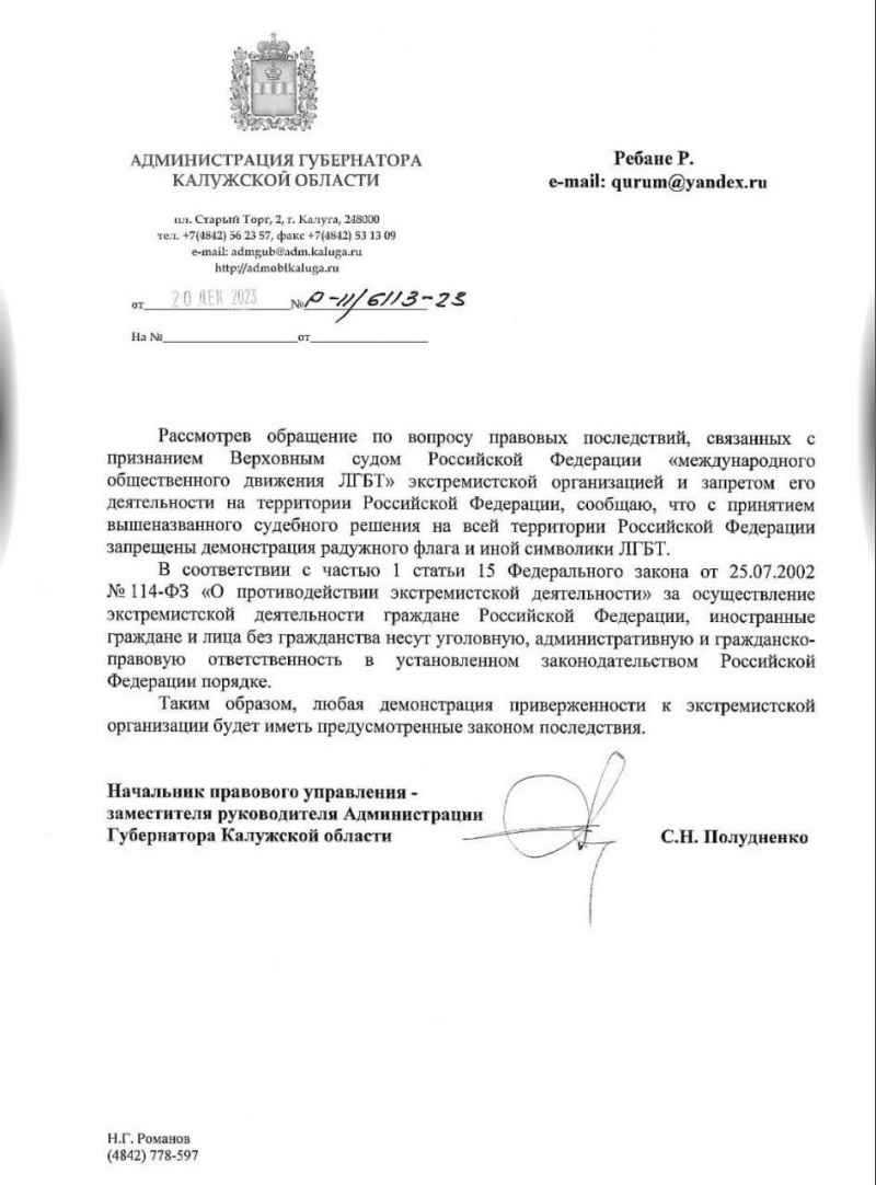 "В ответе правового управления все понятно изложено. Организация признана экстремистской. Значит, символы и символика этой организации – также несут в себе признаки экстремизма. Будь то флаг или что-то другое. Радуга, как природное явление здесь вообще ни при чем. Оставьте ее в покое. А Калужская область всегда была и будет на страже традиционных российских ценностей, — заявил губернатор Владислав Шапша."