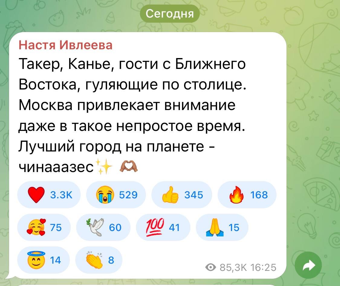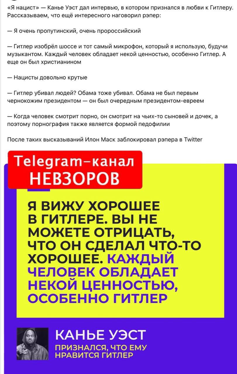 Россияне, которые считают Америку главным врагом и требуют ее уничтожения, пришли в настолько радостное возбуждение, что у отеля Four Seasons, где остановился рэпер, собралась такая толпа, что полиция стала выставлять ограждения и приехала Росгвардия. Но оно и понятно, Уэст - хотя и пиндос, но ихний пиндос, классово близкий: ярый антисемит и большой поклонник Гитлера, за что его товарищ Илон Маск, который отличается большой толерантностью ко всяким фашикам, из своей Х-сети все-таки вышиб.