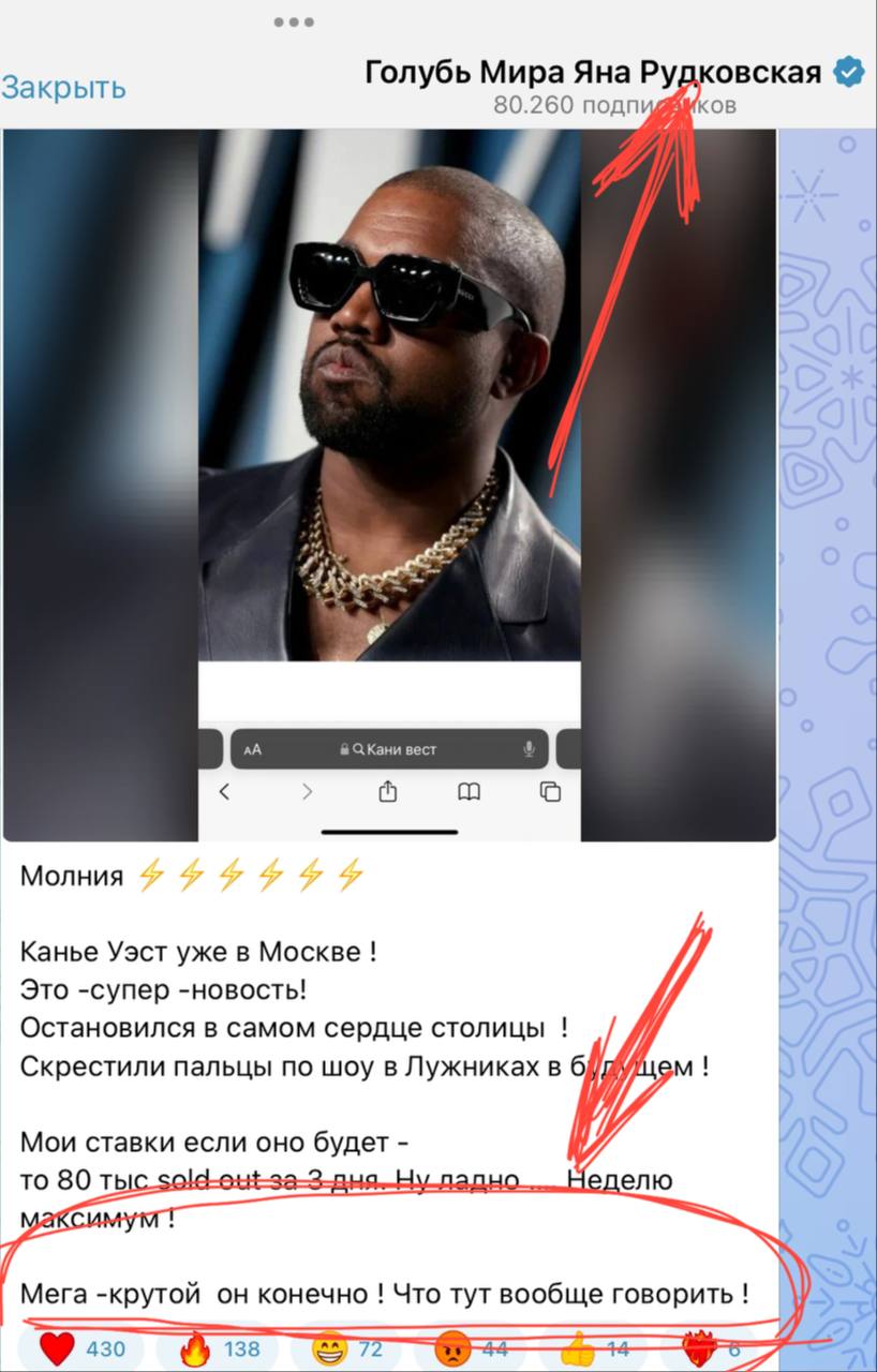 Рудковская начала намекать на "большой концерт в Лужниках", который, как хорошо известно, не планировался даже рядом, и заявляла, что билеты на Уэста раскупят за три дня. Ну, за неделю - максимум. В крайнем случае - за полгода.