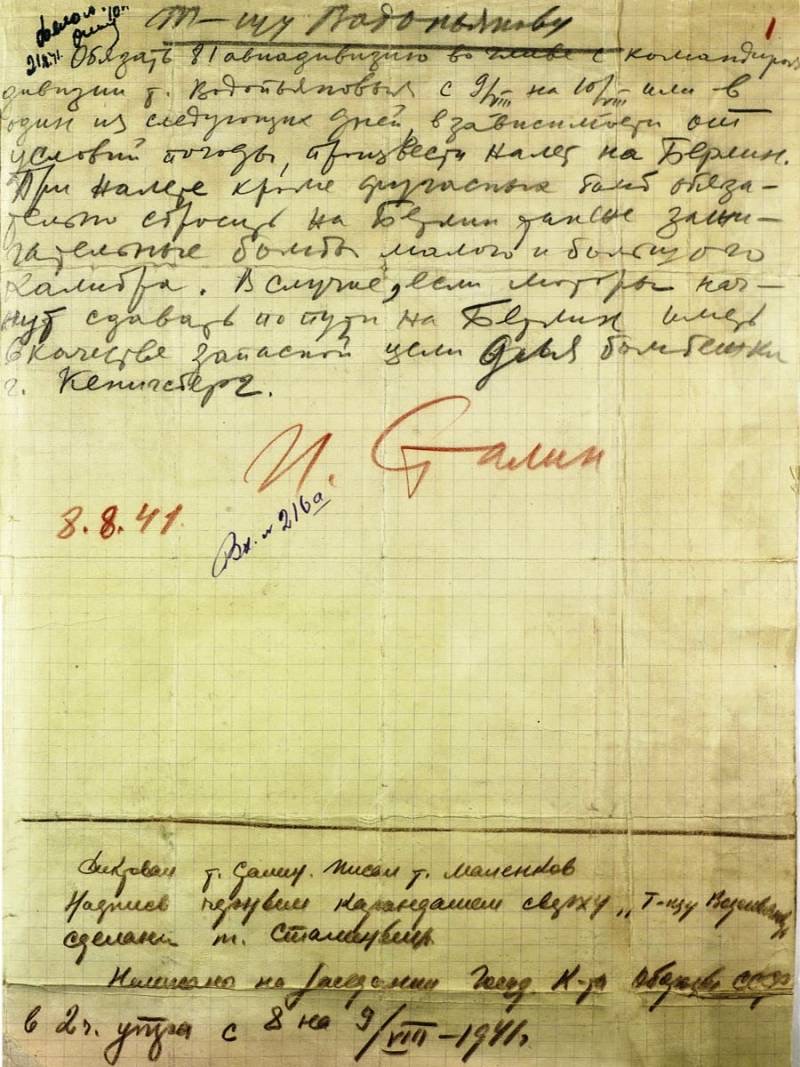 Обязать 81-ю авиадивизию во главе с командиром дивизии т. Водопьяновым с 9.08 на 10.08 или в один из следующих дней, в зависимости от условий погоды, произвести налёт на Берлин. При налёте кроме фугасных бомб обязательно сбросить на Берлин также зажигательные бомбы малого и большого калибра. В случае если моторы начнут сдавать по пути на Берлин, иметь в качестве запасной цели для бомбёжки г. Кёнигсберг.