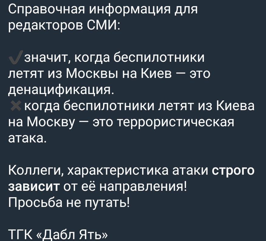 Вторая часть пропаганды призывает: «доколе» и «когда же уже будет ядерный удар», а как верно подметил Алекс, фашистские каналы ей вторят: «нужно уже же шваркнуть чем-нибудь ядерным». Ни у тех, ни у других, также не работает причинно-следственная связь и логика, и нет понимания, что если десятки дронов пролетели, то ответный ядерный удар тем более достигнет цели, что «анала говнет» ПВО всё дырявое.