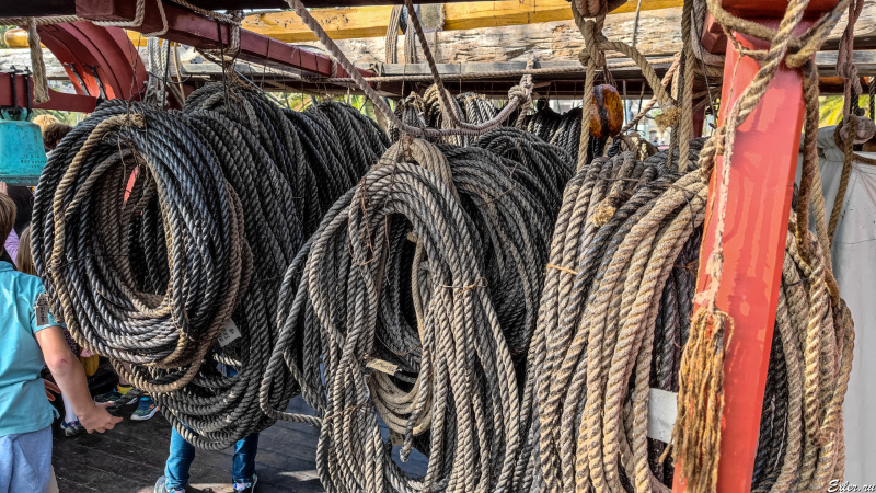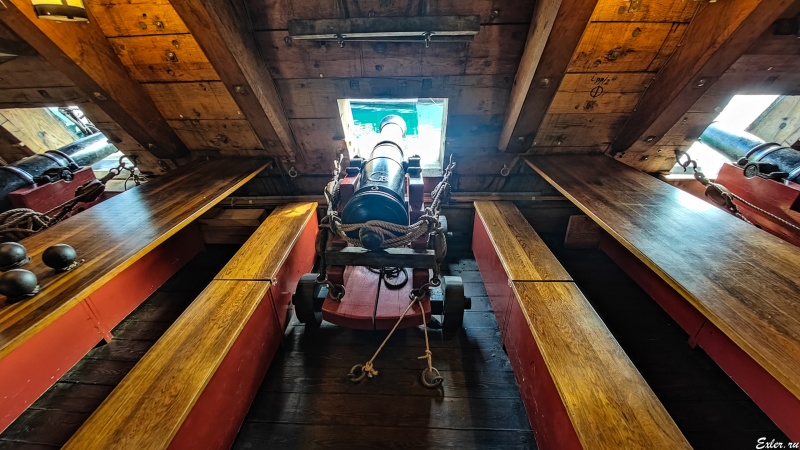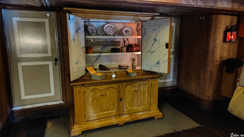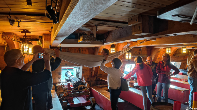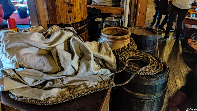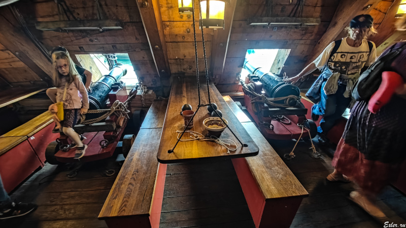В реальности гамаки были намного ниже – тут их явно подняли лишь для удобства посетителей.А вот во время качки вывалиться оттуда крайне сложно – просто потому, что гамак не только имеет "облегающую тело" форму, но и качается вместе с этой самой качкой, хотя бы минимально стремясь к точке равновесия (в отличие от кровати, которая жёстко кренится туда-сюда вместе с судном). Тут разве что морская болезнь может сразить... )))
