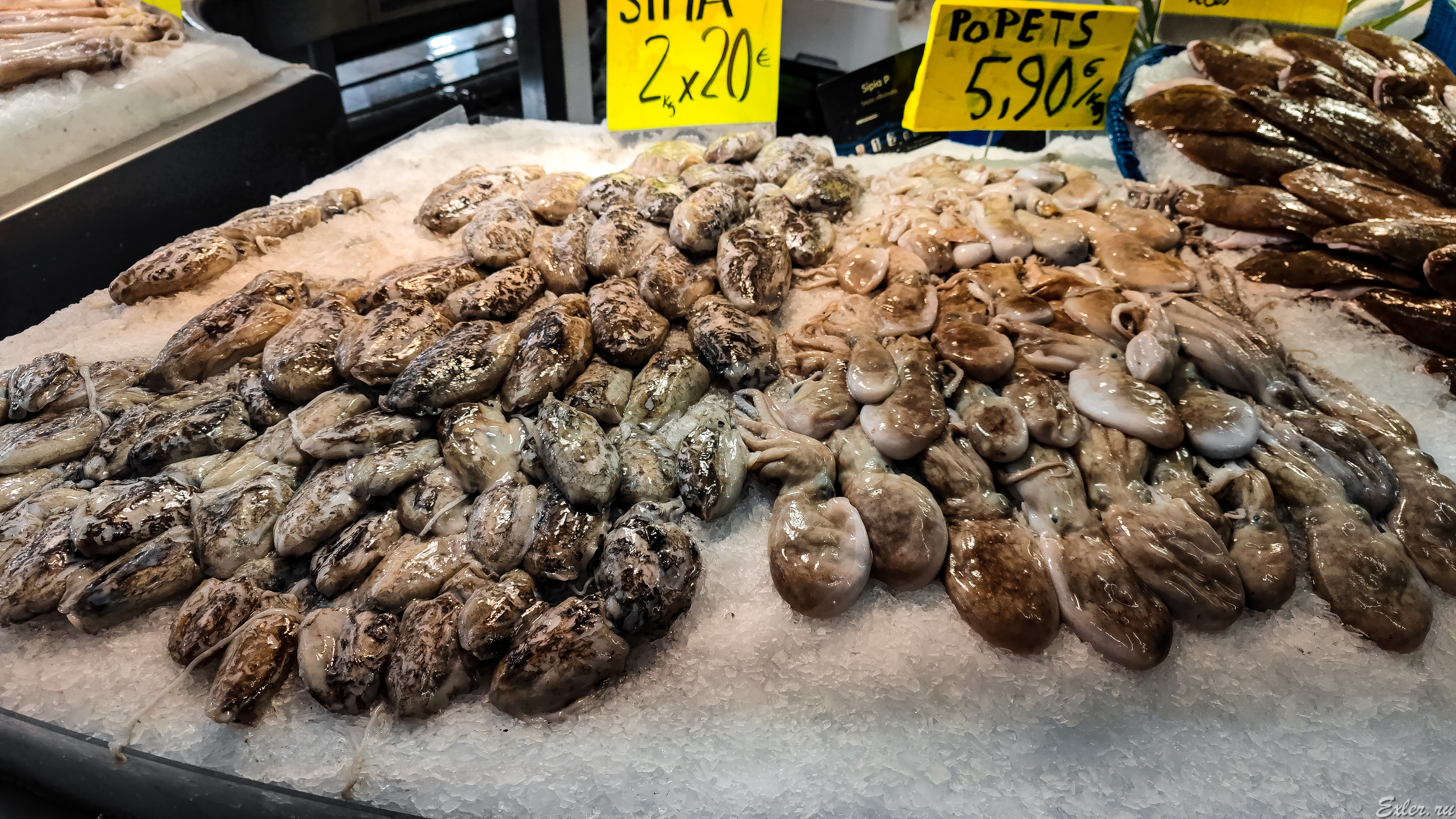 Маленькие каракатицы и осьминожки. Справа - Lenguado, морской язык.