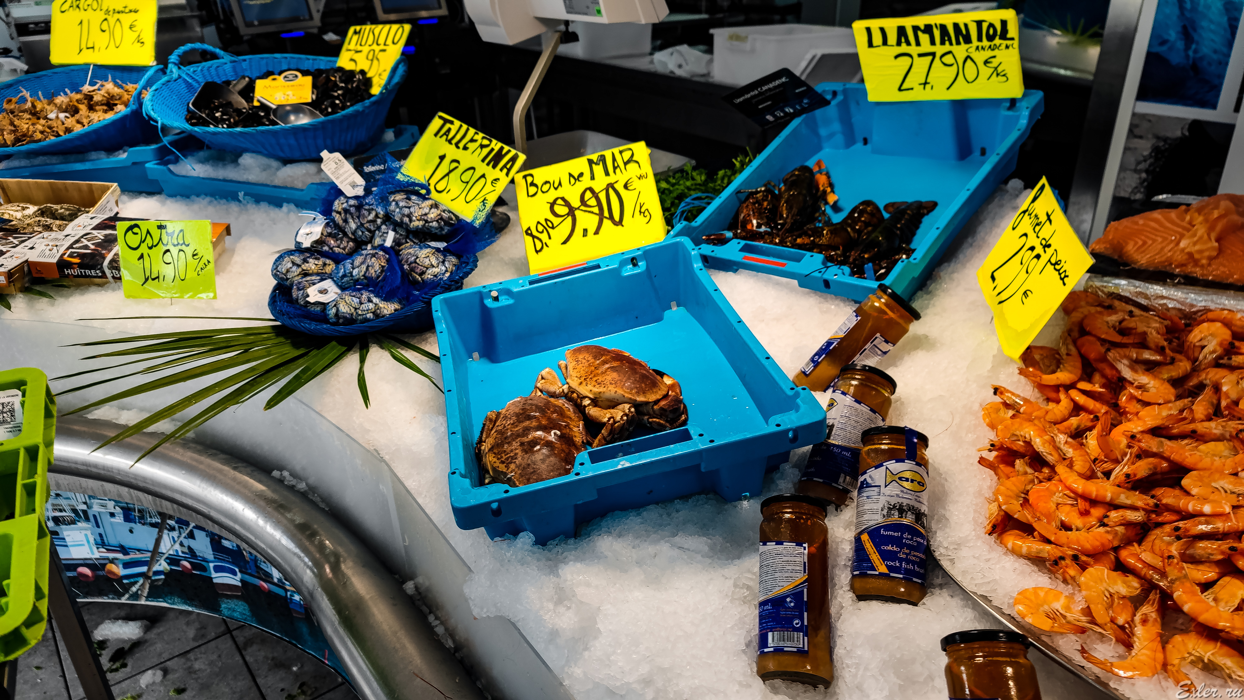 Слева - всякие моллюски и мидии, в центре самые деликатесы - крабы и лангусты. Мы с друзьями договорились на следующей неделе лангустов купить и в котле приготовить.