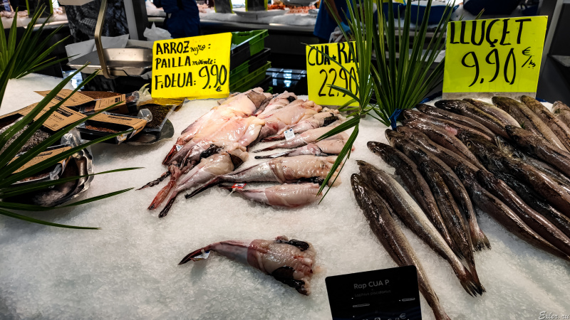 Слева - полуфабрикаты: черный рис для паэльи, паэлья, паэлья из лапши (fideua). В центре - главный местный деликатес Rape (морской черт). Llucet (merluza - разновидность хека).