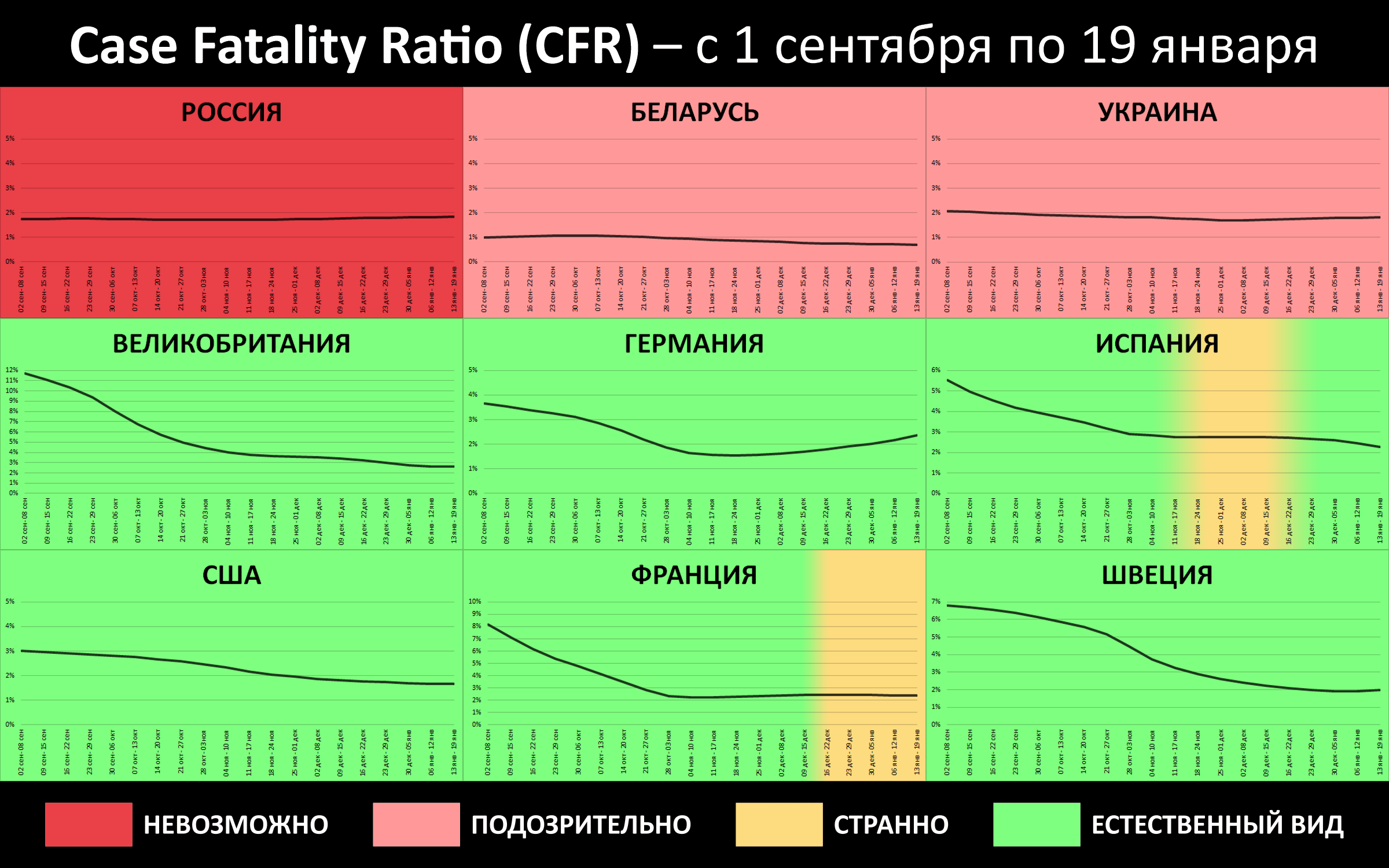 Таким образом, чем явственнее изменения на графике за указанный отрезок времени – тем более достоверной выглядит статистика по стране. Соответственно, чем более график "горизонтален" и чем меньше в нём изменений – тем больше подозрений в тотальных государственных манипуляциях со статистикой по данной стране в данный период...