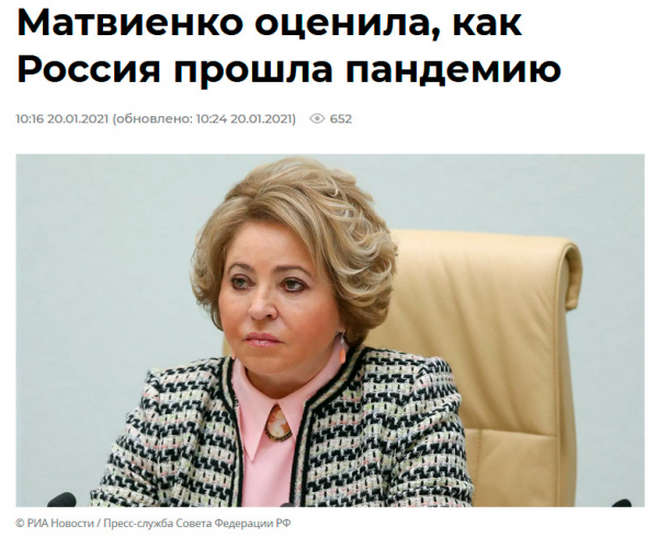 МОСКВА, 20 янв - РИА Новости. Россия, в отличие от многих стран, прошла пандемию с гораздо меньшими издержками, показав прочность государственной и политической системы, заявила спикер Совфеда Валентина Матвиенко на открытии весенней сессии в среду.