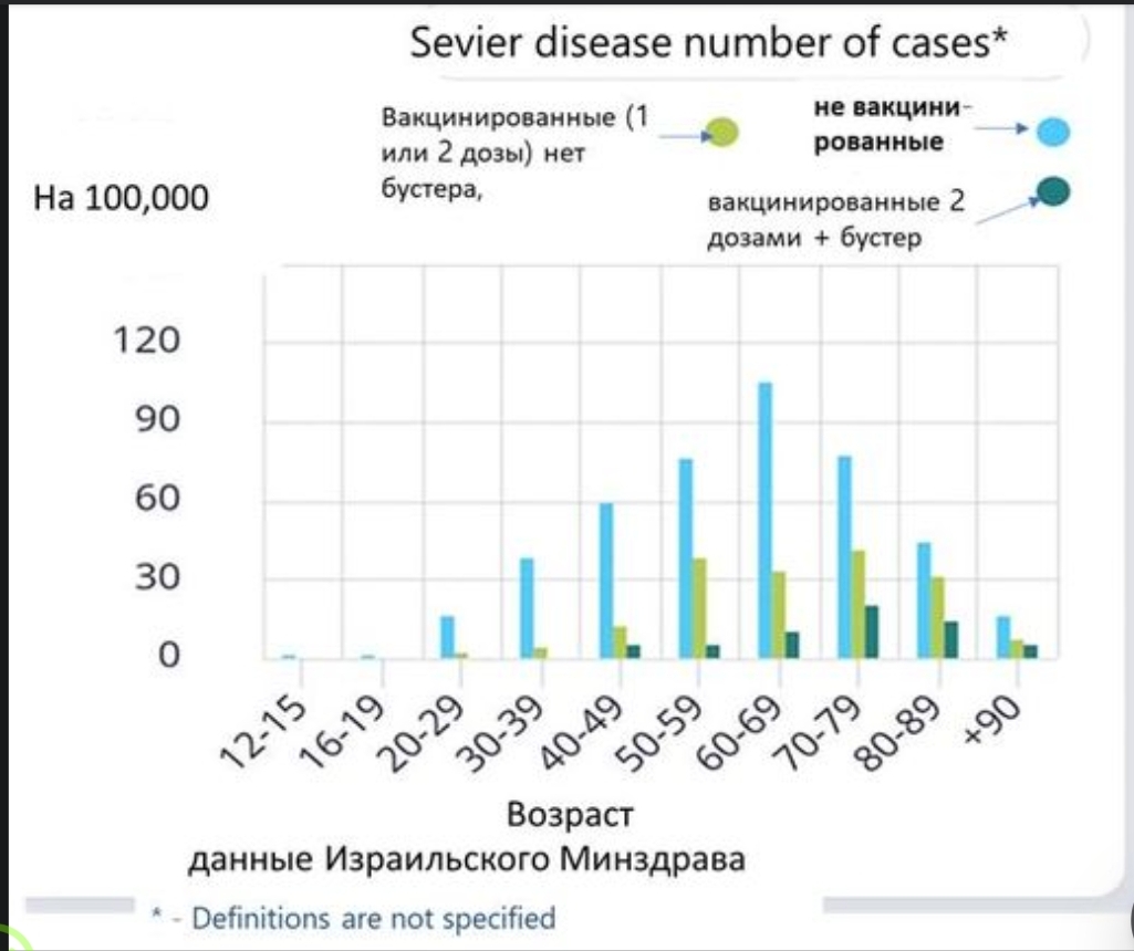 Мы с Марией и Давидом перевели и показываем Вам картинку «Регистрируемые клинически, выраженные случаи С-19 в зависимости от статуса вакцинации Файзером, по возрастным группам в Израиле» . Определения «клинически выраженных случаев С-19», принятого в Израиле, я не знаю, но будем считать госпитализация.