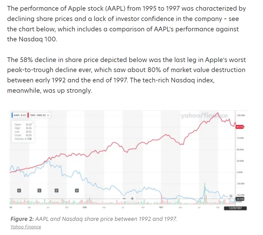 • Финансовые трудности Apple: К середине 1990-х годов компания Apple испытывала серьезные финансовые трудности, и ее будущее выглядело неопределенным. В 1997 году акции Apple торговались на исторических минимумах, и компания несла убытки. Хотя цитата «90 дней до банкротства» часто повторяется, это было скорее драматическое выражение тяжелого положения компании, чем точная финансовая хронология.