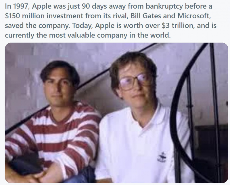 Пошел выяснять, правда это или нет. Выяснилось, что Microsoft действительно инвестировала $150 миллионов в Apple в тот момент, когда компания испытывала огромные трудности после 18 месяцев убытков, в которые Apple вогнал своей деятельностью тогдашний генеральный директор Джон Скалли. И эта сделка, заключенная Стивом Джобсом, позволила Джобсу снова вернуться в Apple в качестве генерального директора.