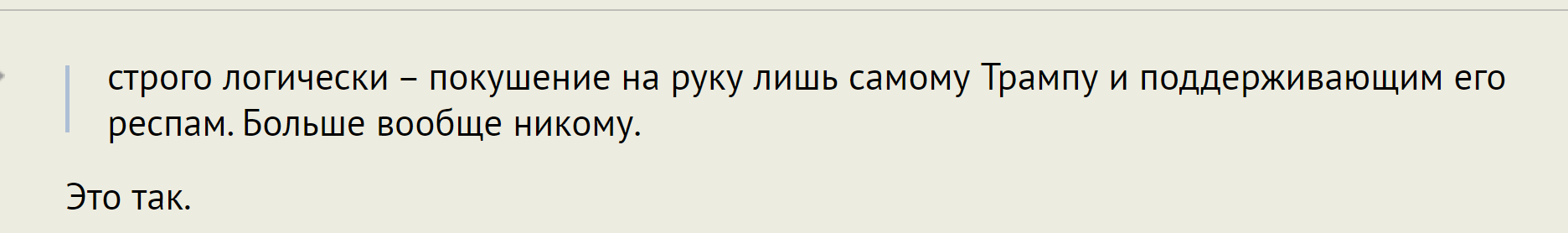 Если уж даже совсем удариться в махровейшую конспирологию, то строго логически – покушение на руку лишь самому Трампу и поддерживающим его респам. Больше вообще никому.
