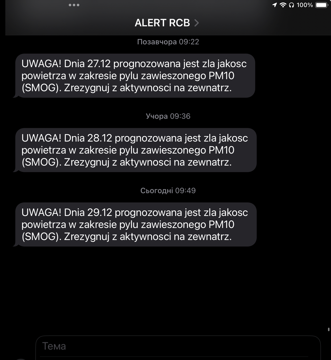 (посмотрите какие смс уже третий день мне приходят, на улице штиль, мороз и смог дышать которым противно).