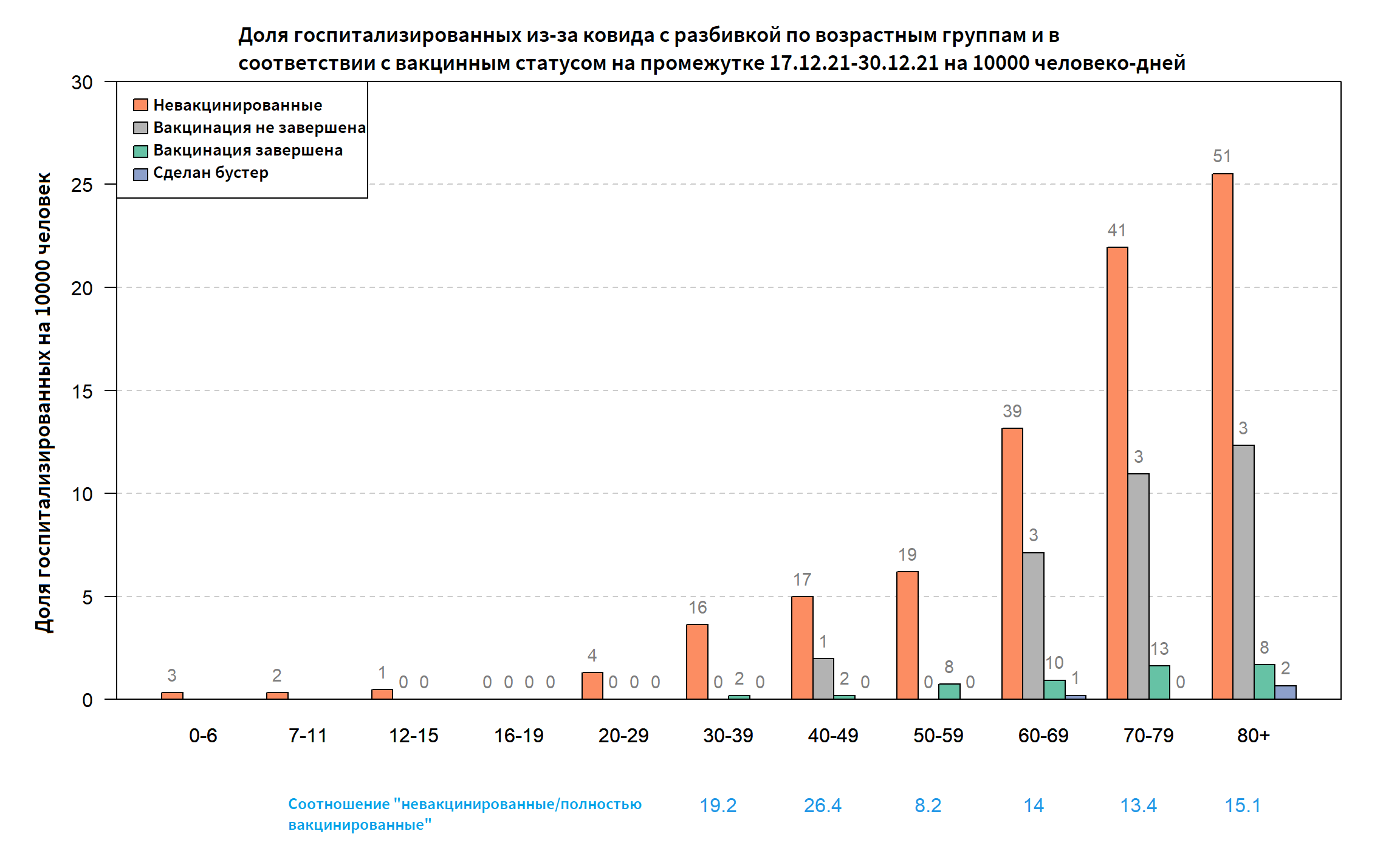 В категории 16-60 в интенсиве побывали 27 вакцинированных и 185 не вакцинированных. При том, что в целом в этой категории населения полностью вакцинированы 75,6%, т.е.  вакцинированных в 3,1 раз больше, чем не вакцинированных. Отсюда можно посчитать снижение риска для вакцинированных в возрасте 16-60 лет оказаться в интенсиве: в 21,2 раза(!!!)
