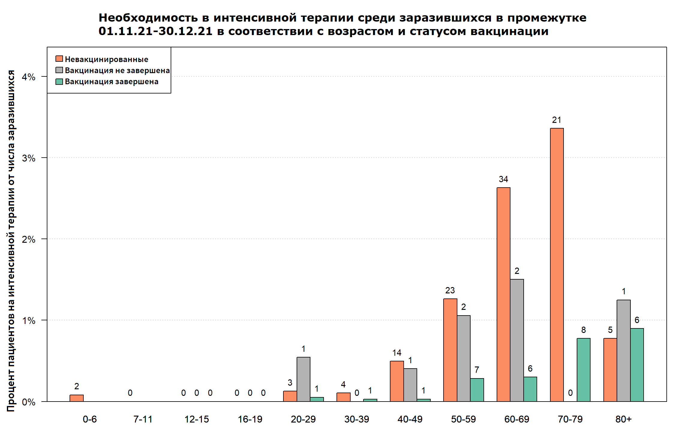 Ещё одна интересная деталь: в обеих возрастных группах в интенсив попадали в основном представители групп риска (лиловая штриховка). Но среди вакцинированных их доля была выше. Это означает, что для тех, кто не входит в группу риска снижение риска попасть в интенсив ещё выше.