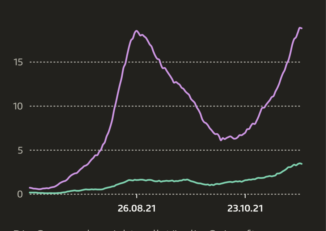 График госпитализации с ковид в Швейцарии. Фиолетовый график непривитые в отношении к млн непривитых, зелёный - привитые в отношении к млн привитых.