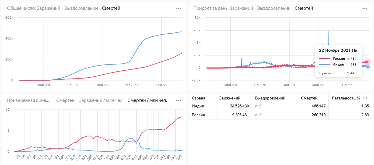 из диаграмм можно сделать два вывода: во-первых, российские вакцины значительно превосходят остальные по эффективности, особенно учитывая относительную массовость фальшивых прививок, во-вторых, смертность от ковида с очень высокой вероятностью имеет связь с расовыми особенностями, которые в просторечии обычно именуются национальностью. И от качества стационарного медобслуживания. Никаких других корелляций не наблюдается.