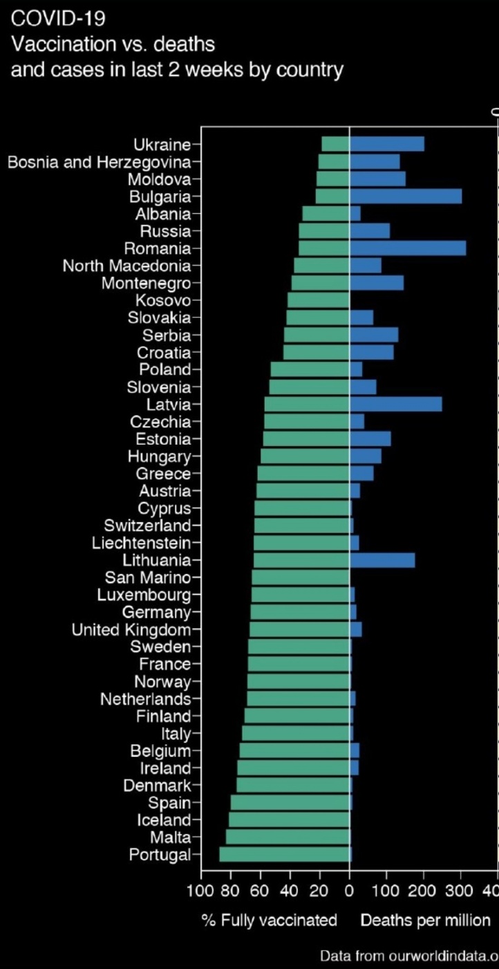 В официальном твиттере Европейского сообщества приводятся вот такие данные по соотношению процента вакцинированных и смертности от коронавируса.