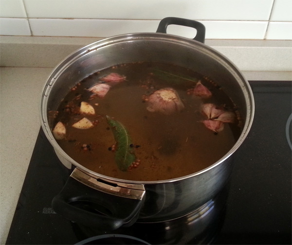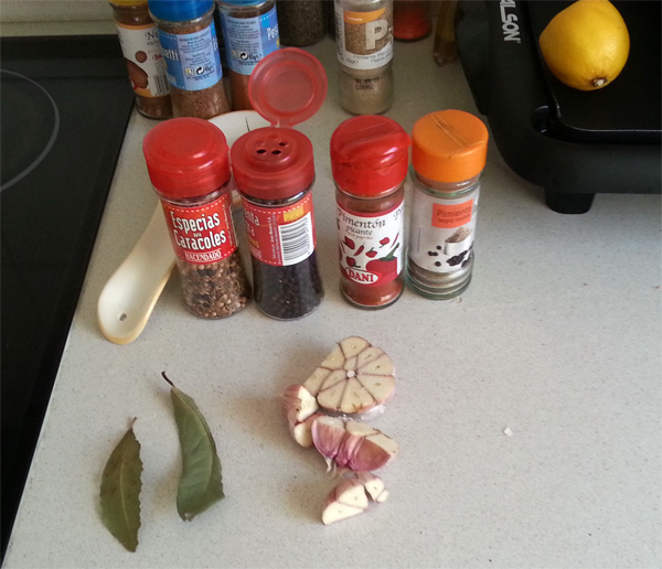 Рецептик между тем достаточно простой. Доводится вода до кипения, слегка подсоливается, туда кидается черный перец горошком (побольше), пара листов лаврушки, молотый перец черный, молотый красный перец пикантный, сухой укроп (другого тут просто не найти), ну и можно еще всякие каталанские приправки для морепродуктов. Также туда кидается - это самое важное! - увесистая головка чеснока, просто разрезанная поперек.