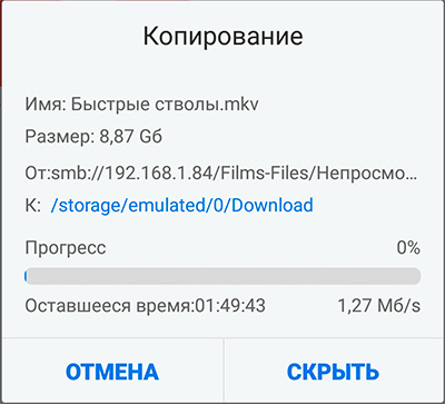 То есть ожидаемая скорость перекачки из локальной сети - где-то 5-7 мегабайт в секунду. Качаю - да, от 4 до 5 мегабайт, то есть вполне похоже на ожидаемые показатели. И FullHD воспроизводится нормально и без тормозов.