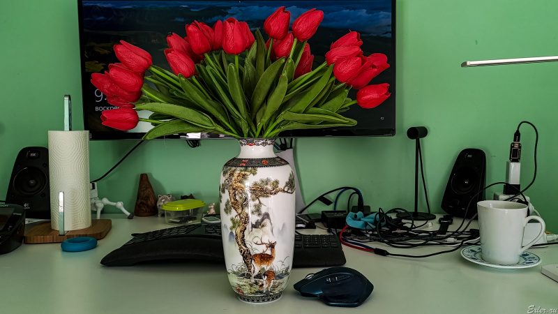 Как верхний край вазы совпадает с нижним краем монитора, справа вообще одна линия.