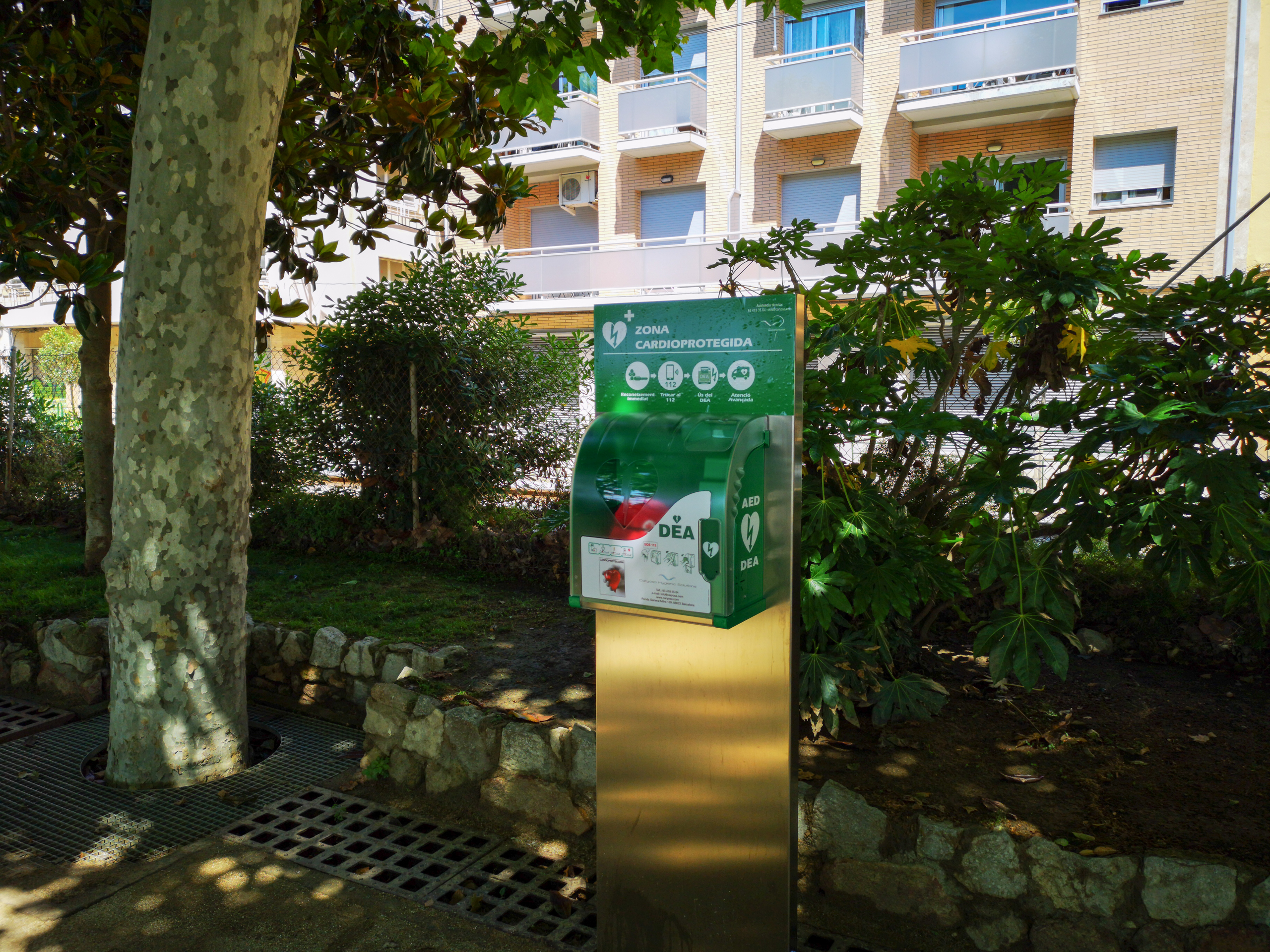 У нас на аллее, которая идет вдоль моря, поставили вот такой пункт неотложной помощи при сердечных приступах. Раньше я такие только в Монако видел, а теперь их ставят по всему Евросоюзу. На размещенных на столбике картинках перечислены действия, которые нужно предпринять, если у человека сердечный приступ, и там есть дефибрилятор, который нужно применить, если ситуация критическая. Вообще такие установки жизни спасают, насколько мне известно.