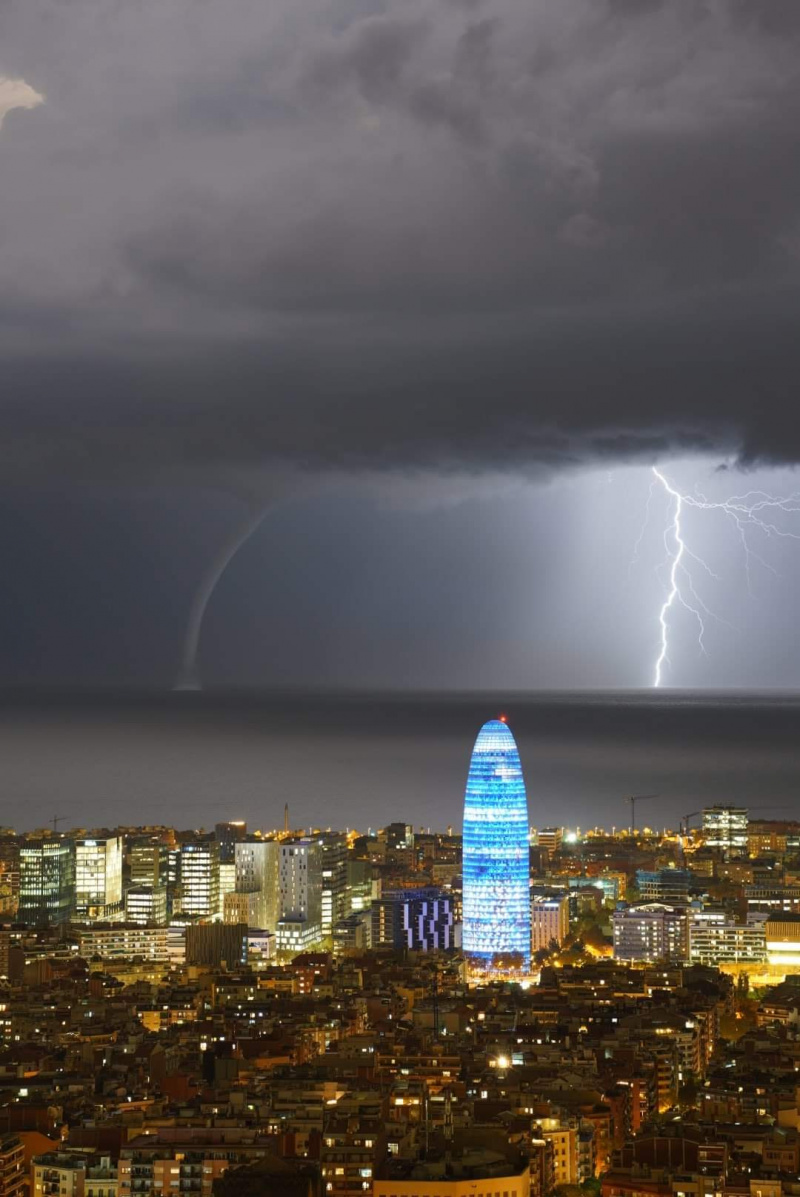 Красиво смотрится торнадо на фоне ночной Барселоны. Единственное, что портит впечатление - это стеклянное уродское здание форме продукции Баковской фабрики резиновых изделий. Зачем только испанцы построили это? Хуже только смотрится небоскрёб в Париже, который всё собираются снести, но никак не снесут.