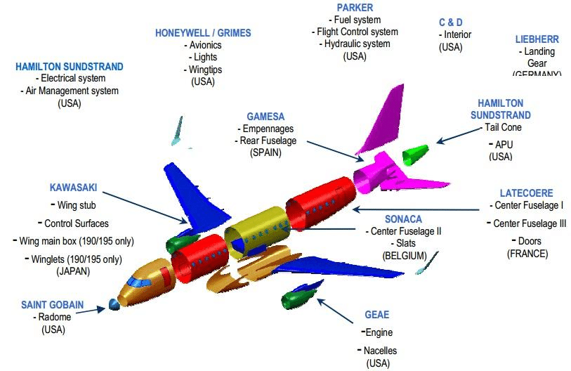А она точно бразильская? Вот раскладка по поставщикам прямого конкурента SSJ - Embaer E-190. Найди там надпись Brasilia. Не нашел? Срочно беги на бразильские форумы! Бразильский народ столько лет обманывали!!!!!! 😄)))))