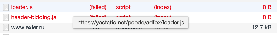 Теперь ждем, пока сайт загрузится и в окне отладчика смотрим, в ответ на какие запросы нам сказали "таймаут".
