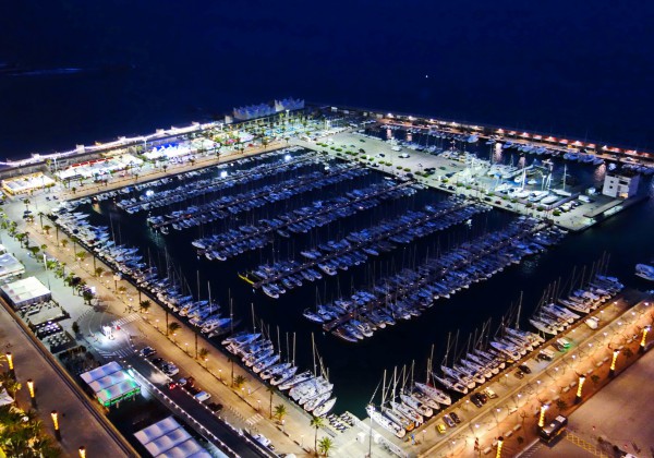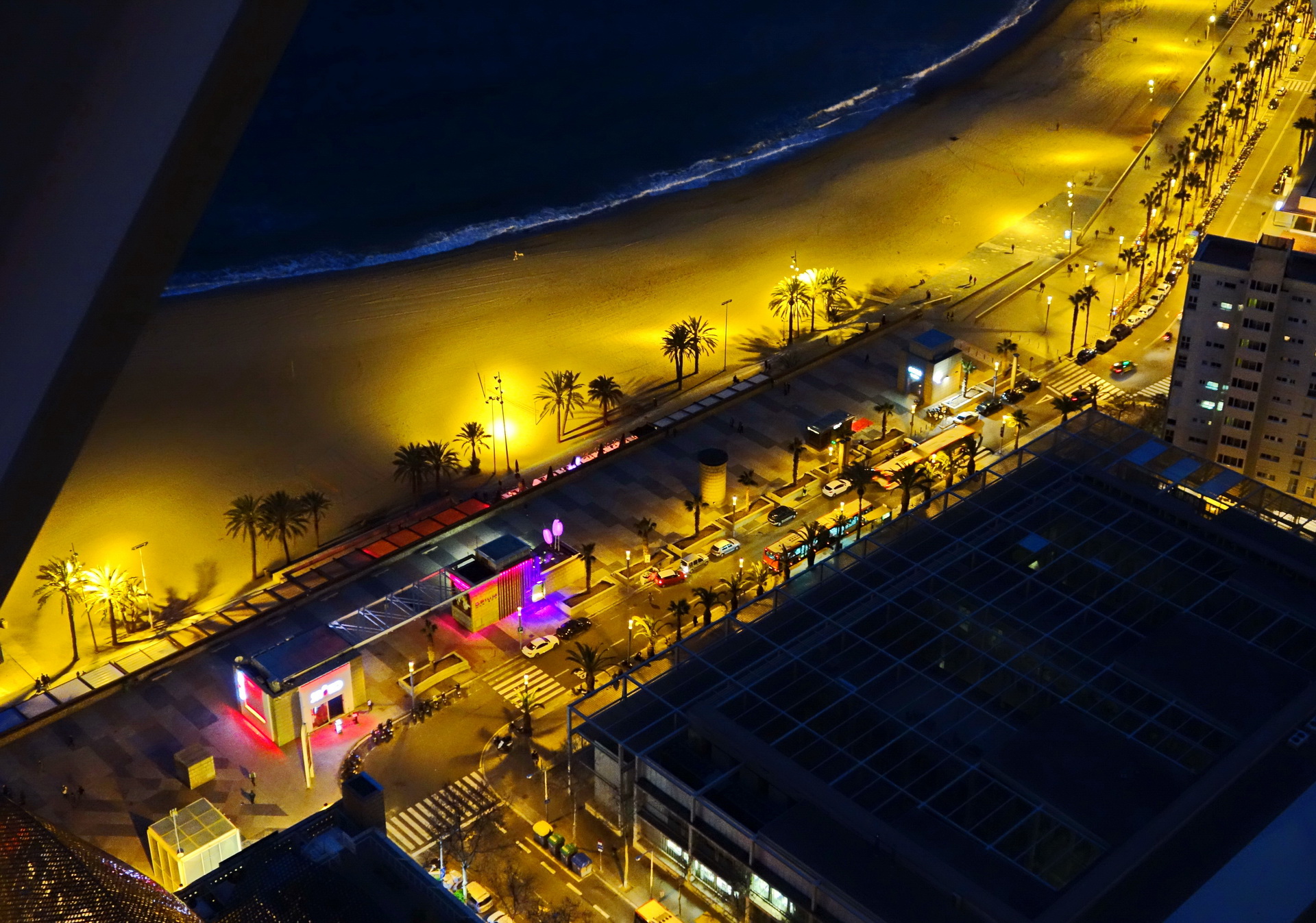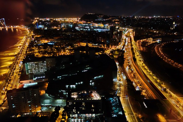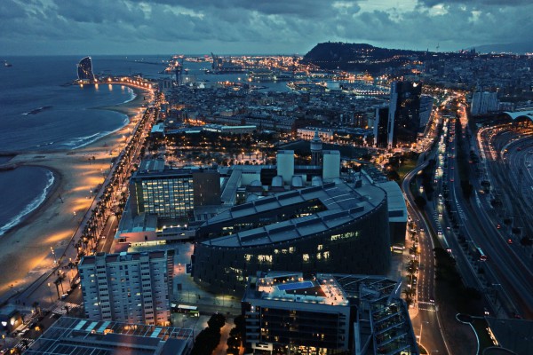 Виды вечерней и ночной Барселоны с 42 этажа отеля Arts Barcelona.
