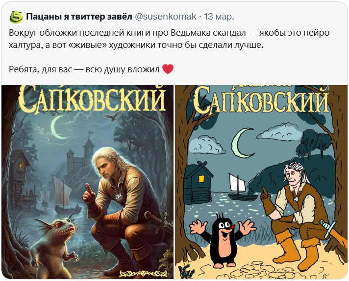 Первый - когда официально заявил. что обложки нарисованы художником, а не ИИ, а второй. когда на рисунках обнаружился водяной знак Shutterstock. 😄