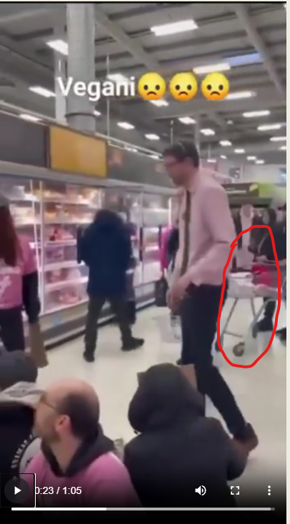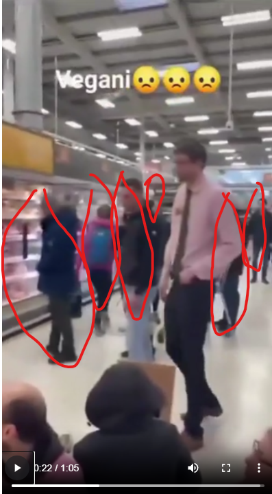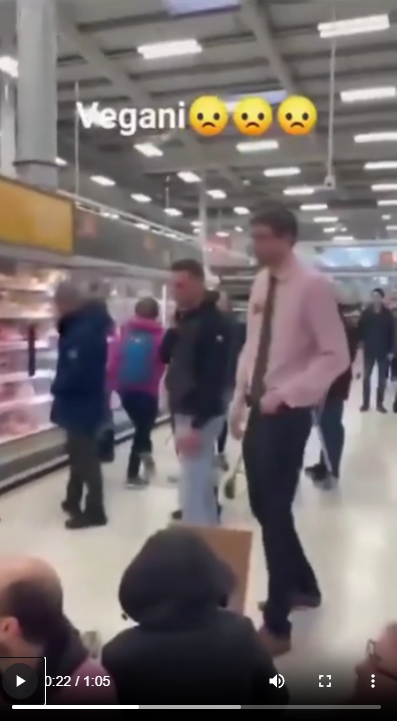 Оказывается, есть очередные ударенные на всю голову активисты "Веганское восстание". И они устраивают акции по блокированию проходов в супермаркетах рядом с холодильниками, где продаются мясные продукты, и пытаются мешать посетителям супермаркета покупать мясо.