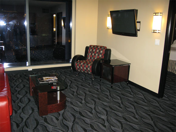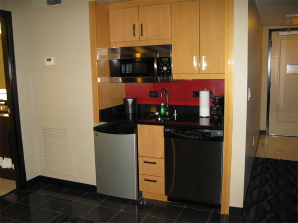Тут гостиная со здоровенной ЖК-панелью, спальня с ЖК-панелью, ванная комната с еще одним телевизором (нафиг, правда, мне все это нужно), в гостиной есть мини-кухня: там холодильник, посудомоечная машина, микроволновка и кофемашина.