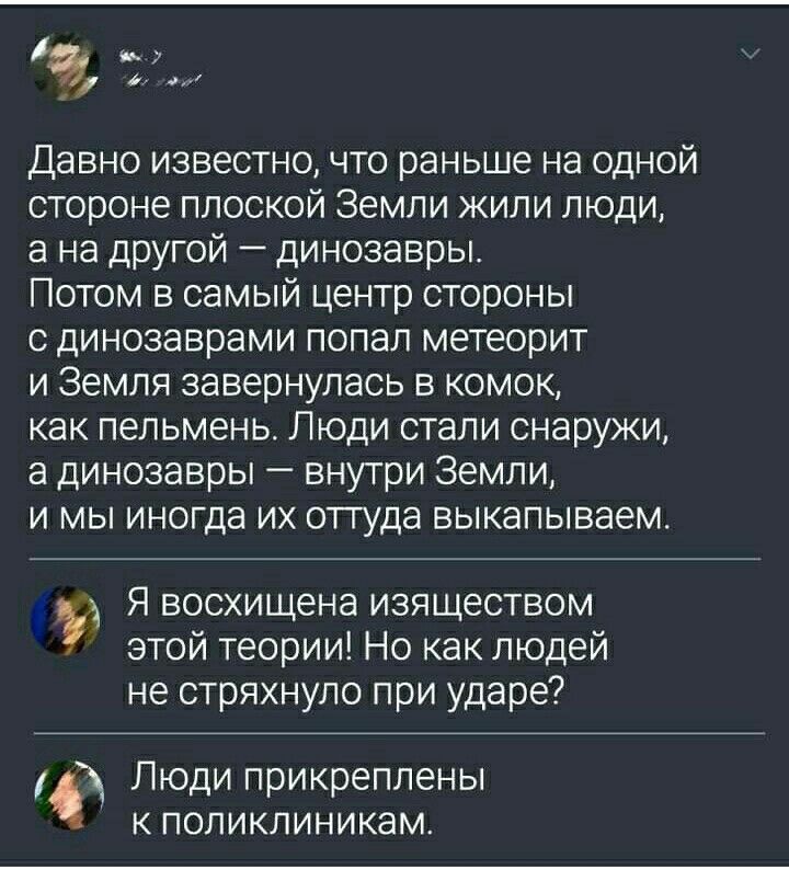 4. И так далее. То, что называется картиной мира - это динамический продукт, ежедневно создаваемый и проверяемый миллионами ученых по всему миру, чем бы они не занимались. И среди этих ученых - друзья, родственники и однокласники плоскоземельщика... Они тоже в сговоре? У каждого из верящих в заговор врачей есть знакомый врач.Его можно спросить, в кокой момент он стал заговорщиком, при выдаче диплома или кровавый договор принес позже главврач? Ой, короче