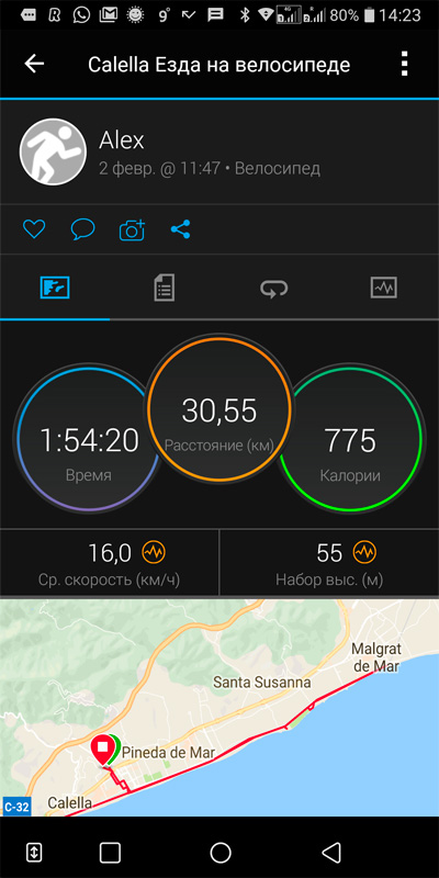 Средняя скорость пока низковатая, но я за скоростью не гонюсь, мне важнее всего - равномерность нагрузки и соответствующий каденс. Сейчас обычно каденс держу в районе 80-85 - это на пересеченной местности, где в основном - грунтовка различной степени накатанности, временами с песком. И катаюсь пока на тяжелых грязевых шинах - надо будет взять комплектик полусликов, а то нынешние шины сделаны для других условий.