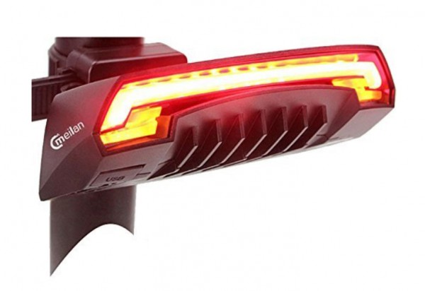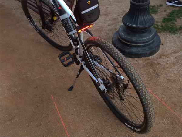 У этого свое питание (USB-порт), датчик освещения, три режима свечения (ровный, мигающий, бегущая полоска) плюс он умеет показывать поворотники (маленький пультик крепится к рулю) и лазером по бокам от велосипеда рисует безопасные габариты.
